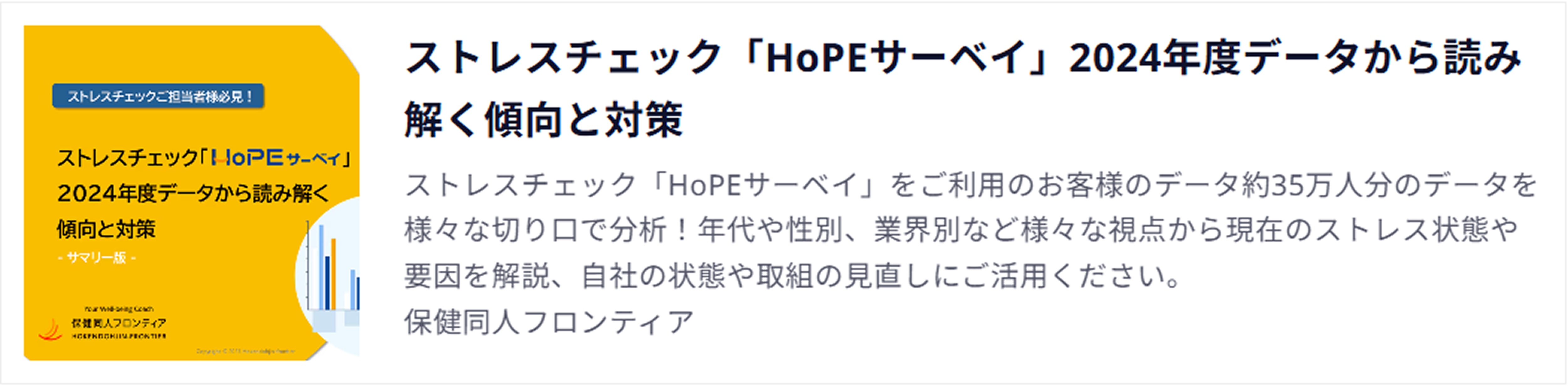 「HoPEサーベイ」では、こうした職場改善のプロセスを一気通貫で支援するツールとして、多くの企業で導入が進んでいます。ストレスチェックを組織改善につなげたい方は、ぜひ導入をご検討ください。