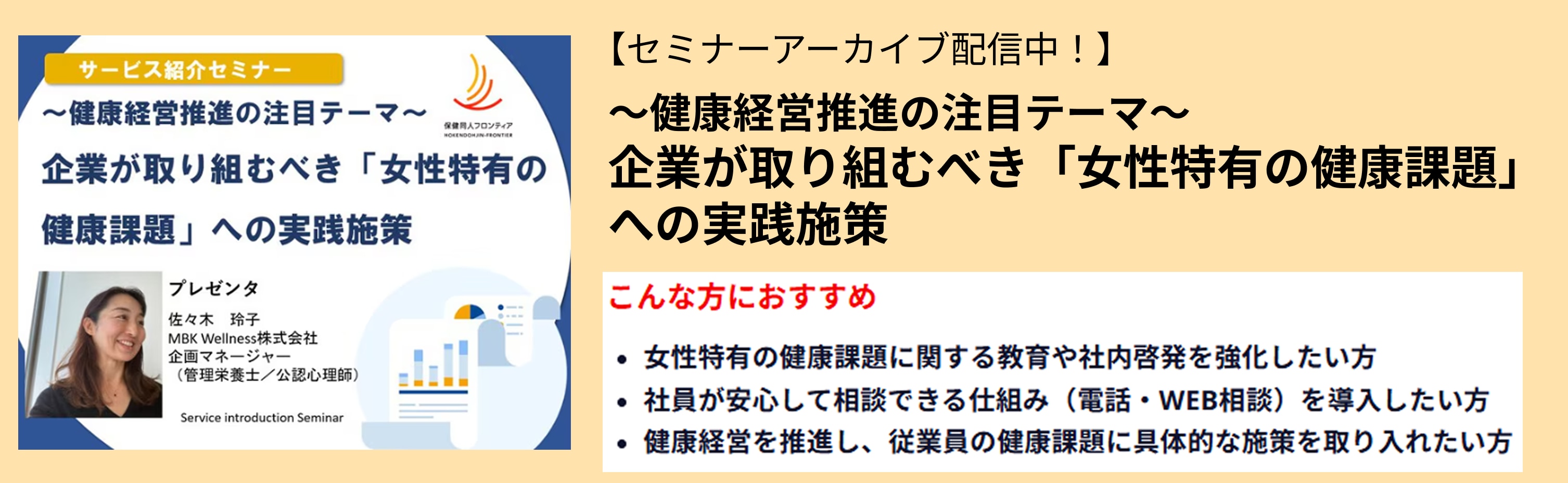 【関連する資料】セミナーアーカイブ資料「~健康経営推進の注目テーマ~ 企業が取り組むべき女性特有の健康課題への実践施策」