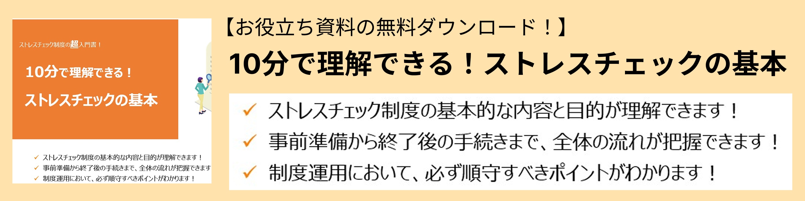 という方に向けて、ストレスチェックの基本をまとめた資料を作成しました!無料でダウンロード可能ですのでぜひ以下からチェックしてみてください。