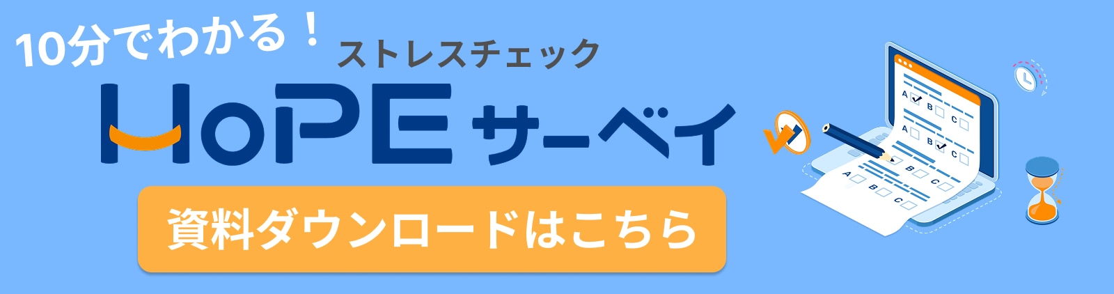 『HoPEサーベイ』のストレスチェックの内容や専任コンサルタントによるサポート内容などについて、わかりやすく解説した資料を無料公開していますので、ぜひこの機会にご覧ください。