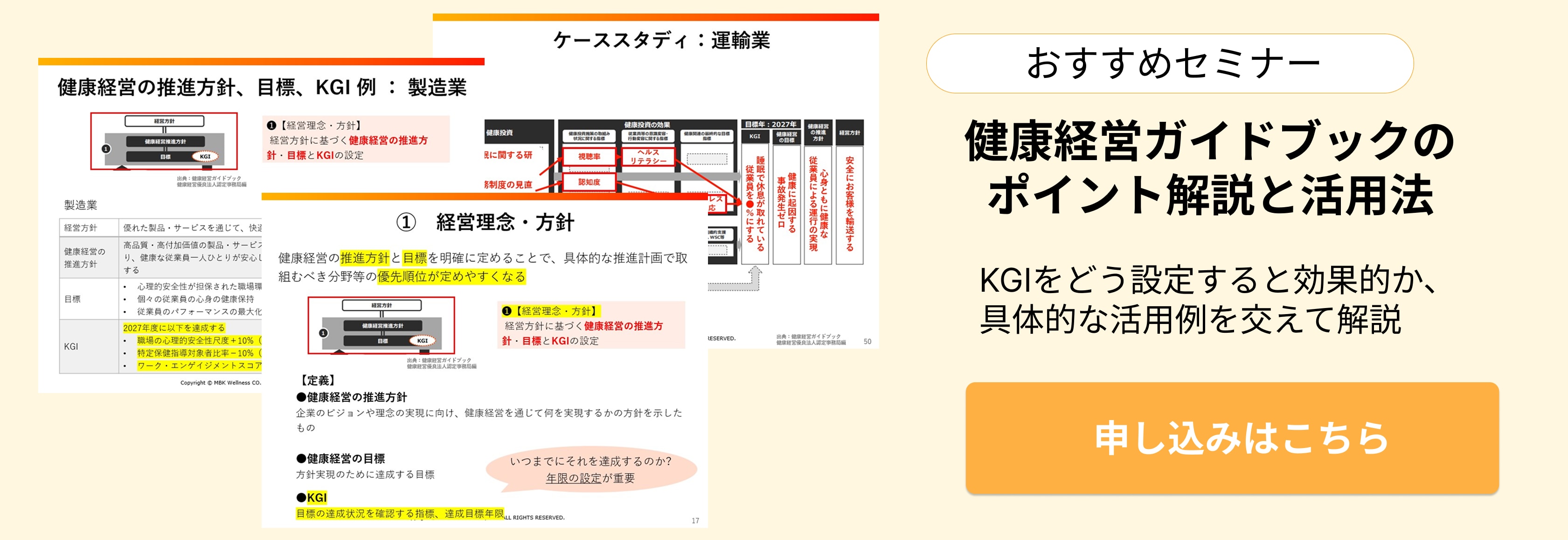 また、健康経営の評価指標については2025年3月に発表された「健康経営ガイドブック」でも言及されており、こちらを元にKGIなどの指標を決めると効果的です。
