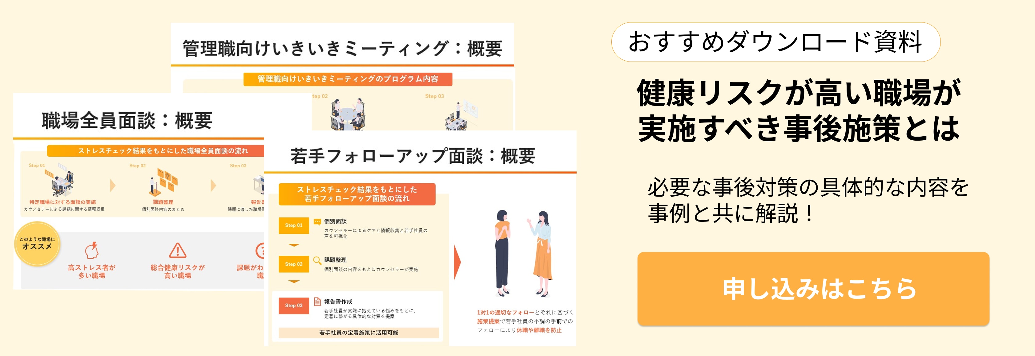 高ストレス者と判定された場合、精神疾患への罹患や休職といった重大なリスクを抱えやすい状態であるため、優先順位を上げて対処する必要があります。